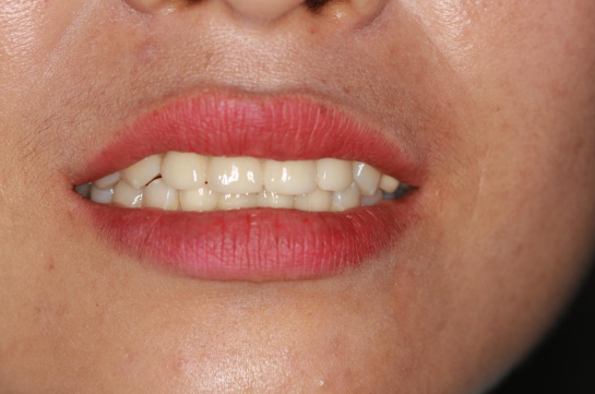下面这位呢?是一位非常爱美的女士。(部分图片丢失请见谅)因前牙散在间隙来诊。曾经来我院咨询过三次,下不了决心,同时也担心修复后的美观问题。